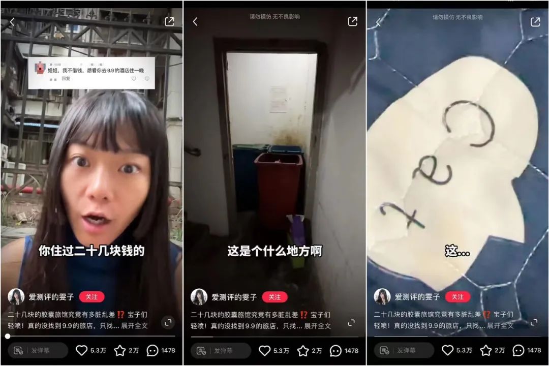 说是旅店,其实是由一间普通楼房改造的简易建筑。从博主迈入“旅店”所处的大楼开始,就散发出了很浓的不妙意味:整栋楼的电梯都已损坏,想上楼只能爬楼梯,楼梯间昏暗无比,还堆放着垃圾。“旅店”内部的环境也很糟糕,根据博主描述,一进门就能闻到很刺鼻的烟味,所谓的胶囊仓看上去像是铁皮搭建,并不隔音,仓内的床单上有着黄黄白白的不明污渍,配合着仓外其他租客的声音,一晚上下来雯子几乎没有睡着,被这次测评“折磨”得不行。