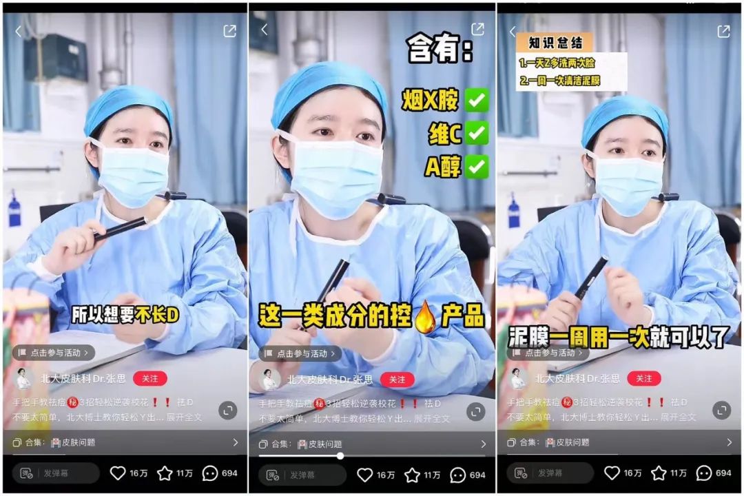 @北大皮肤科Dr.张思 ,不仅有顶级名校北京大学的专业背景背书,在视频中她还总是身穿白大褂,拍摄地点选在医院 、诊疗室等场景,潜移默化地提升了自己在观众心中的专业程度,视频内容也围绕医生与普通人之间的信息差展开。
