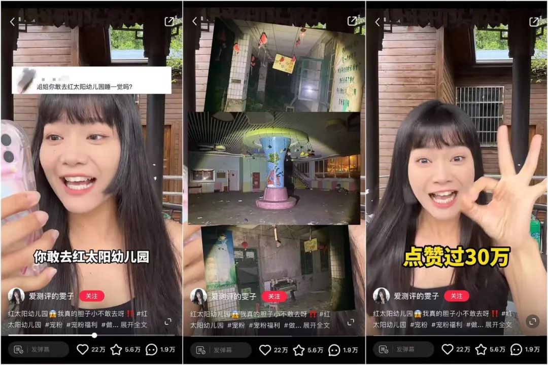 比如像吊带盲盒、卷发神器等日常用品的评测,往往在当条视频中就会拍摄展示,而“挑战到火车站旁边的旅馆住一晚”“去红太阳幼儿园睡一晚”等另类挑战,则分别被提出了要视频点赞过10万和30万的条件。