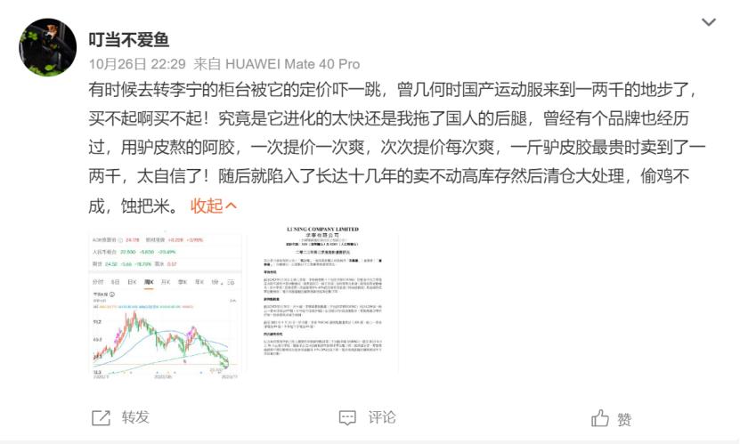 在进入到2023年之后,“我把李宁当国货,李宁拿我当冤大头”等吐槽频繁在社交平台上出现;更有网友发文把李宁类比为“用驴皮熬的阿胶”,“一次提价一次爽,次次提价次次爽,随后就陷入了长达十几年的卖不动高库存然后清仓大处理”。