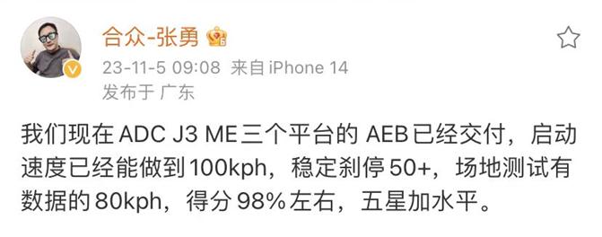 哪吒CEO张勇则是在个人微博中“安利”自家产品:“我们现在 ADC J3 ME三个平台的 AEB已经交付,启动速度已经能做到100kph,稳定刹停50+,场地测试有数据的80kph,得分 98%左右,五星加水平。”