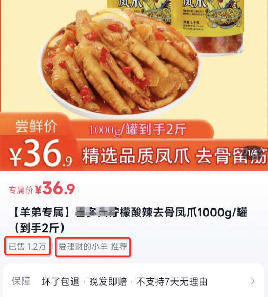 “小羊”直播时也卖鸡爪,当然几乎都退了。他主要合作的一款36.9元2斤装的鸡爪,抖音官方显示已售出1.2万件——这或多或少证明,有些人真买了。