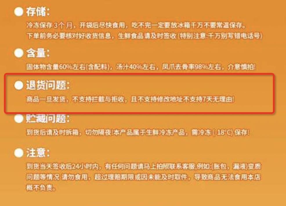 我们也通过这款商品的详情页了解到,发货后,这一单品目前是不支持物流拦截、拒收、修改地址,以及7天无理由退款的。在电商消费普遍支持7天无理由退款的当下,我们有理由猜测,这可能是商家基于“小羊”直播间惊人的退款率,而进行的单独设定,以降低自身损失。