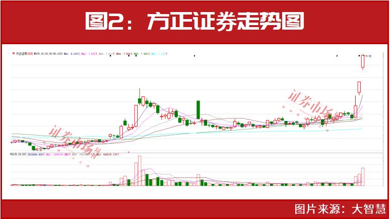 个股方面,方正证券表现最为强势,已连续录得两个涨停板(见图2),三个交易日累计大涨接近30%。此外,信达证券、光大证券和第一创业等同样表现抢眼。