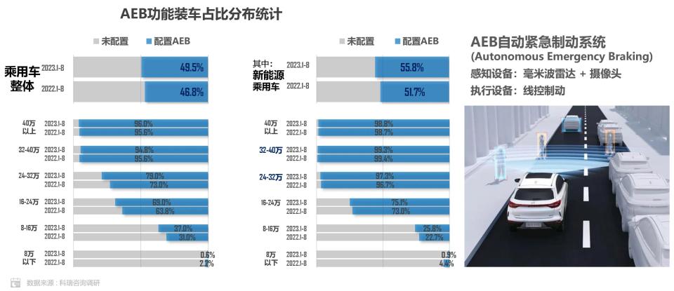 从整体来看,截至今年年中,乘用车配置AEB功能占比为49.5%,其中新能源车配置该功能占比稍高,达到55.8%。而16万元以上的乘用车对于该功能的普及率已达到67%。