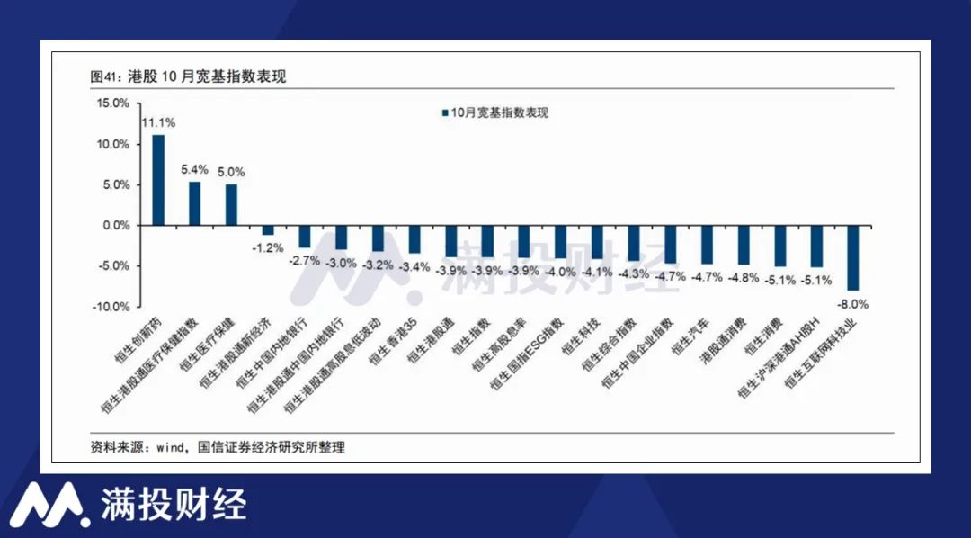 从港股市场相关板块的表现来看,随着医疗反腐事件的消化和减肥药行情的发酵,医药板块持续修复。港股10月宽基指数中,恒生创新药成为最耀眼的指数,涨幅为11.1%;恒生港股通医疗与恒生医疗在10月的涨幅也超过5%。减肥药成为资金加仓的主线,带动医药行情反弹。