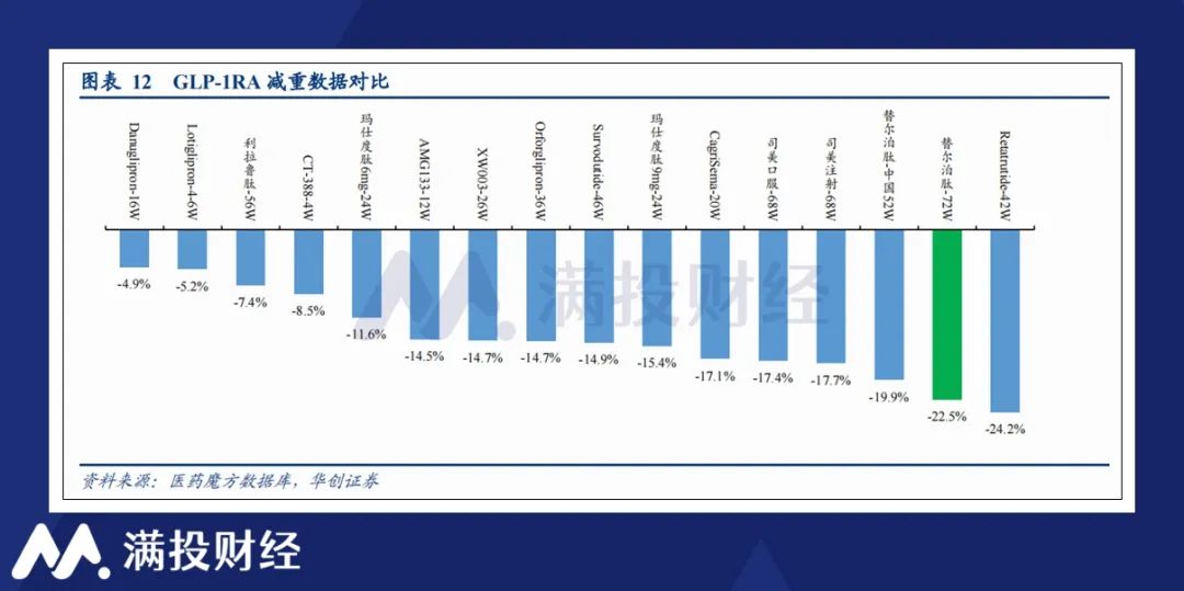 如果仅从减重的角度,从已上市的GLP-1类药物来看,替尔泊肽和司美格鲁肽的临床减重效果最好,根据医药魔方III期临床试验结果显示,替尔泊肽的减重幅度能达到22.5%,司美格鲁肽的减重幅度能达到17.7%。而近期,礼来制药公司推出的瑞他鲁肽(Retatrutide),被称为史上最强减肥药,临床减重数据达到了24.2%。