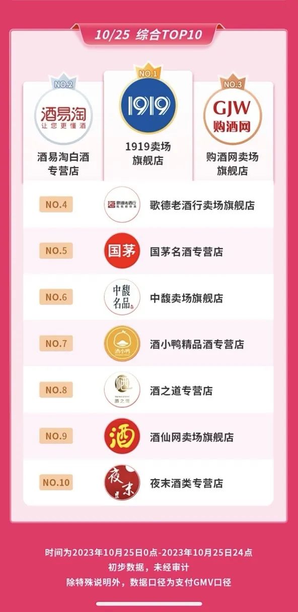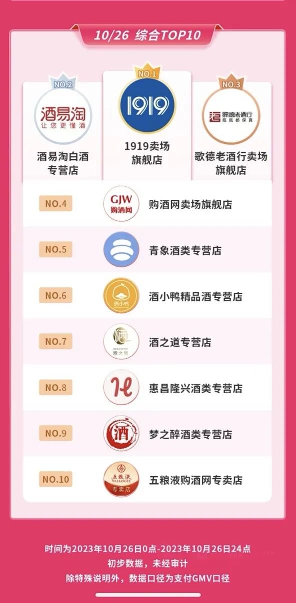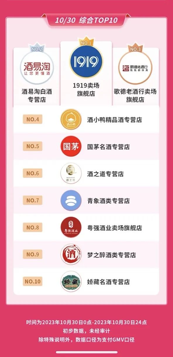 再看1919在这次直播预售上的情况,其相关负责人对「界面新闻·创业最前线」表示,淘宝天猫的榜单暂时还没有出来。但在该负责人提供的抖音榜单中,10月25日、26日、30日及11月4日,1919卖场旗舰店GMV位于榜首。