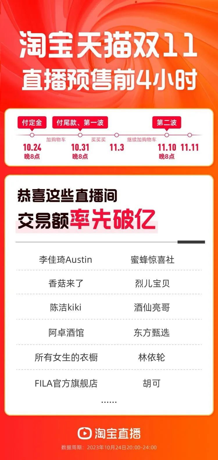 随着双十一开始,淘宝直播公布了直播预售前4小时战报,交易额率先破亿的主播中,酒仙亮哥榜上有名,实现预售金额2.64亿元。