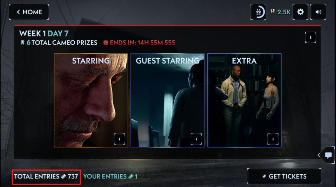 《飞升》“玩家客串”抽奖页面, 显示目前奖池中有 737 张门票