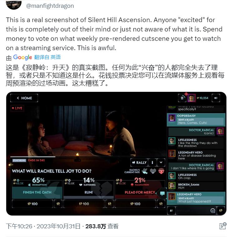 从《行尸走肉:最后一英里》的反馈来看,核心的“公投”玩法本身是足够有趣的。区别于《完!美!》这类游戏,更多考虑玩家的情感诉求,所以会让玩家掌握绝对主动权;公投的公共属性更强,个体力量有限,投票项目也更多关乎人性、道德,比如主人公是否要说出真相、某位角色的去留等等。游戏希望引发玩家对类似问题的思考,在游戏社群中展开讨论,通过这个过程达到与角色“同呼吸共命运”的体验感。但是《飞升》的核心问题在于引发玩家群体讨论后,没有做好承接,无论是加入功能单一的实时公开聊天还是放弃颇受欢迎的“每周真人复盘”直播,多少透露着一丝草率,导致玩家体验大打折扣,加上在公投玩法中给氪金玩家加权重,大大打击了非氪金玩家的积极性。