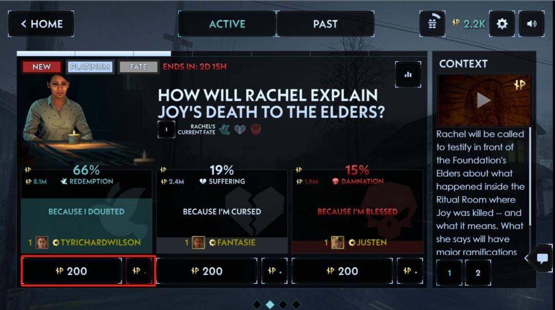 除此之外,在玩家与剧情交互的设计上,也不是由每位观众独立选择感兴趣的剧情线,而是所有玩家共同投票决定。在游戏中,投票不是“一人一票”,而是引入了一个“IP”(influence points)的概念,玩家可以为某个选项贡献出不定数额的 IP,截止时间后点大的选项胜出,剧情会按公投出来的方向发展。而 IP 可以通过玩小游戏,包括解谜、消除等,或者直接氪金获取。