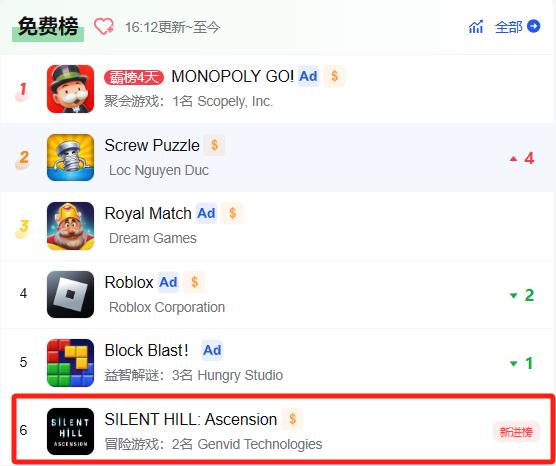 《SILENT HILL: Ascension》登上全球 69个国家Google Play游戏下载榜 Top100