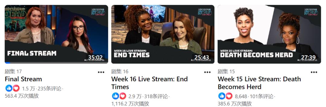 2、《行尸走肉:最后一英里》还有一个非常有趣的设计是邀请了两位人气演员来每周揭晓、讨论大家本周的选择,相当于是带领玩家复盘。目前人气最高的直播回放视频在 Facebook 上观看量破千万,相对低的也有数百万。但是或许是由于成本控制的原因,《飞升》并没有延续这一设计。