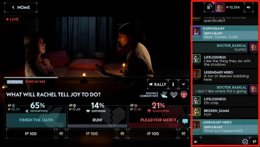 看到这里,很多人可能会联想到弹幕游戏,根据大家的“投票”来实时影响游戏走向。但显然,《飞升》这样的内容,依照目前的技术情况,还完全做不到。一般,一场投票的开放时间在 3 天左右,游戏团队虽然每天“直播”,但是以周为单位,根据一周的投票结果,来确定下周的剧情走向,对已有素材进行编辑继续“直播”。据游戏的研发商 Genvid Entertainment 透露,游戏共准备了 36 个潜在结局,预计会在直播完结之后,再将部分未解锁剧情向玩家开放。