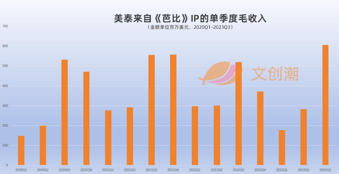 文创潮统计发现,美泰的众多IP与品牌中,2023年第三季度《芭比》毛收入(Gross Billings)达到6.051亿美元,同比增长16%,折算人民币约44.28亿元,占美泰整体收入的接近1/3。