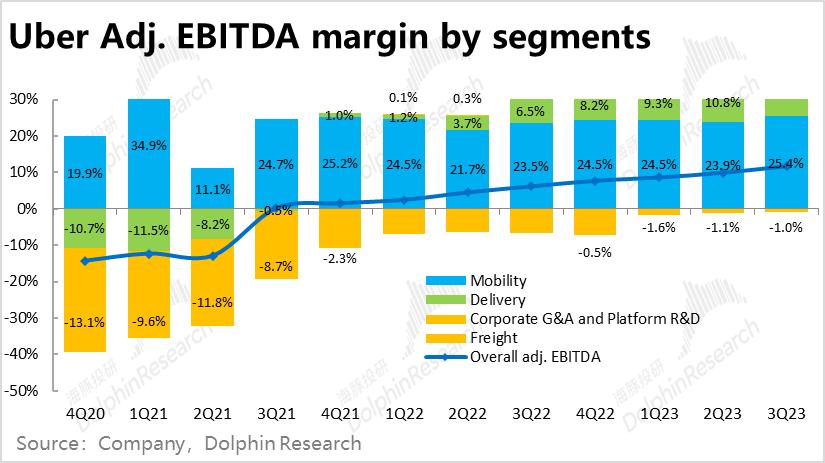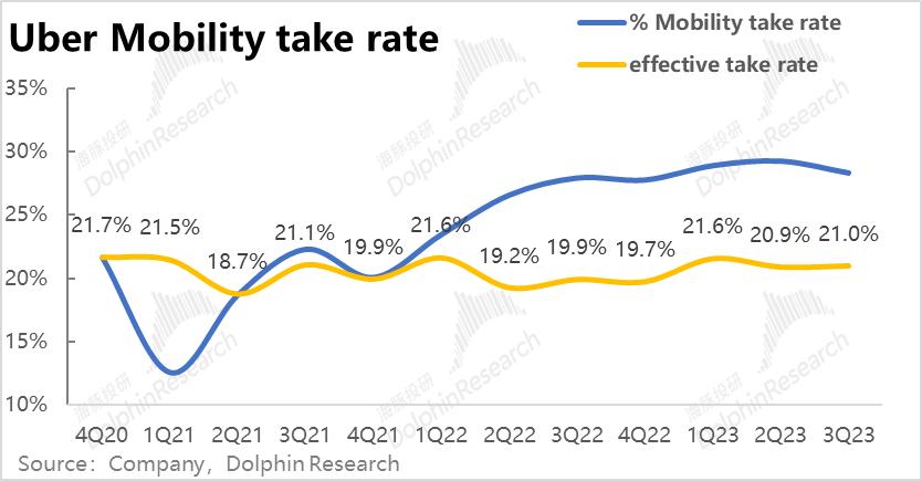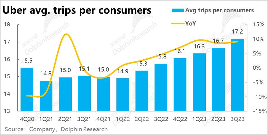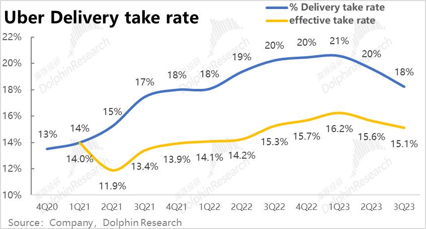 但下单频率上,本季度人均下单次数达到17.2次,较上季的16.7次继续稳步提速。海豚君认为Uber one交叉会员,以及公司分别在打车和外卖板块上拓展出的新产品,促进了用户黏性和打开率的上升,在新用户增量已放缓的情况,仍帮公司实现了不俗的增长。