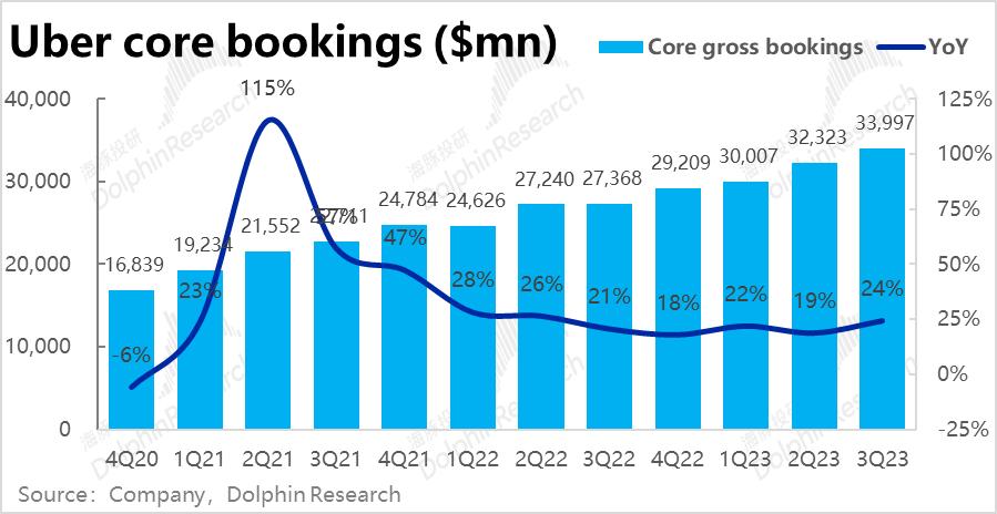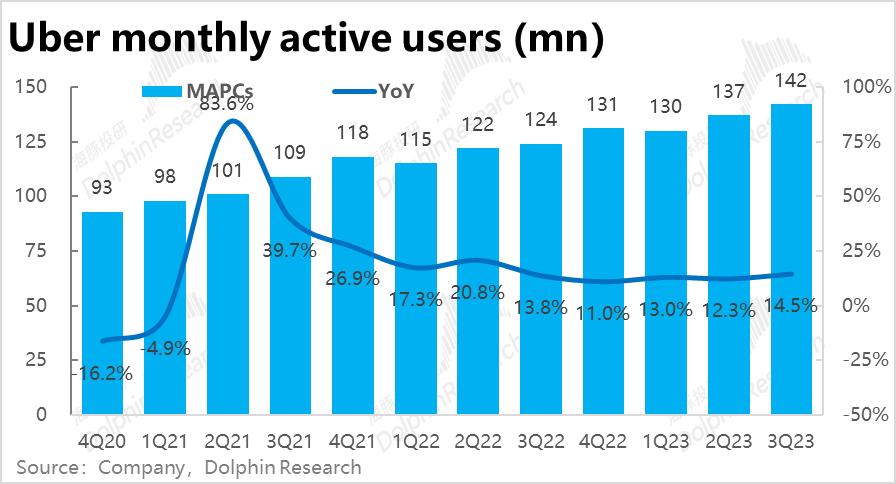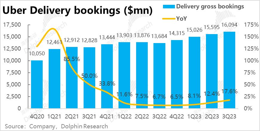 疫情后逆风的Uber的外卖业务本季实现订单金额161亿元,同样小超市场预期的158亿,同比增速触底回升到17.6%,也展现出了边际改善的趋势。