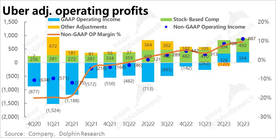 可见本季价和用户的角度表现并算不上好,但Uber用户下单频次的提升,这一关键的改善是公司本季业务量坚挺增长的根本原因。本季度人均下单次数达到17.2次,较上季的16.7次继续稳步提速。海豚君认为融合两大业务的Uber one交叉会员,和公司分别在打车和外卖板块上拓展出的新产品、新品类,增强了用户对Uber的黏性和打开频率,加强了公司中长期的成长潜力。