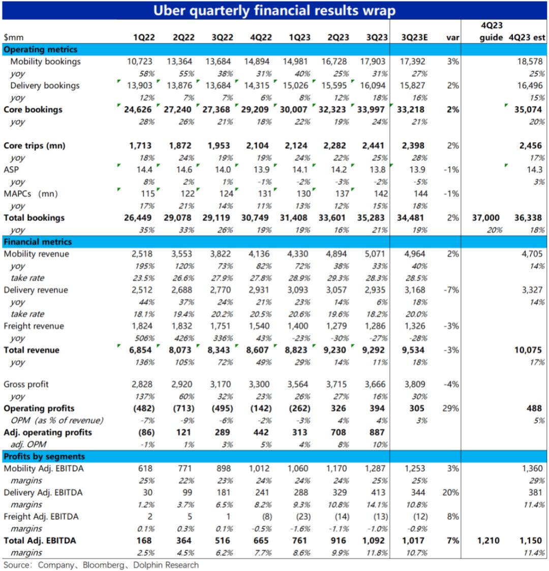 11月7日美股盘前,“国际版滴滴”Uber公布了2023年三季度财报,整体来看:首尾两端的订单额增长(Gross booking)和经营利润率都好于预期,可见需求和利润释放都表现不错;而主要问题是外卖业务变现率下降拖累收入和毛利略低预期,要点如下:
