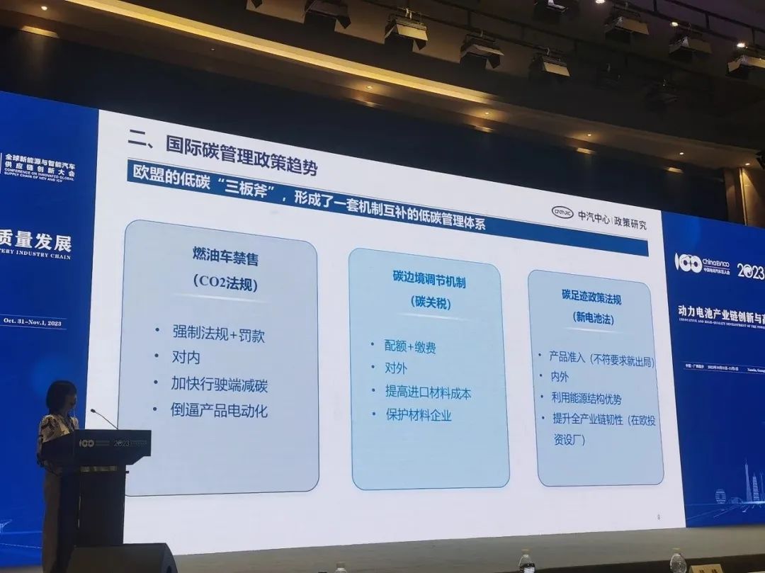 目前已经可以看到,电池会逐渐成为受贸易投资政策波及比较大的领域。欧盟、美国采取部分贸易限制或者打压手段,例如欧盟的《新电池法》规定,2024年开始,只有已建立碳足迹声明的可充电工业和电动汽车电池才能投放市场。
