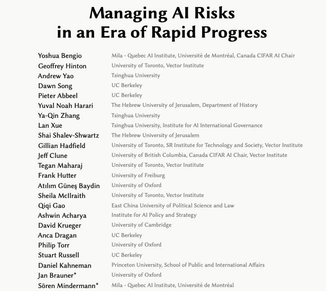除了在 X 上发帖回应,Geoffrey Hinton 甚至联合 Yoshua Bengio 以及全球众多专家学者发表了一篇题为《在快速发展的时代管理人工智能风险》(Managing AI Risks in an Era of Rapid Progress)的共识论文。