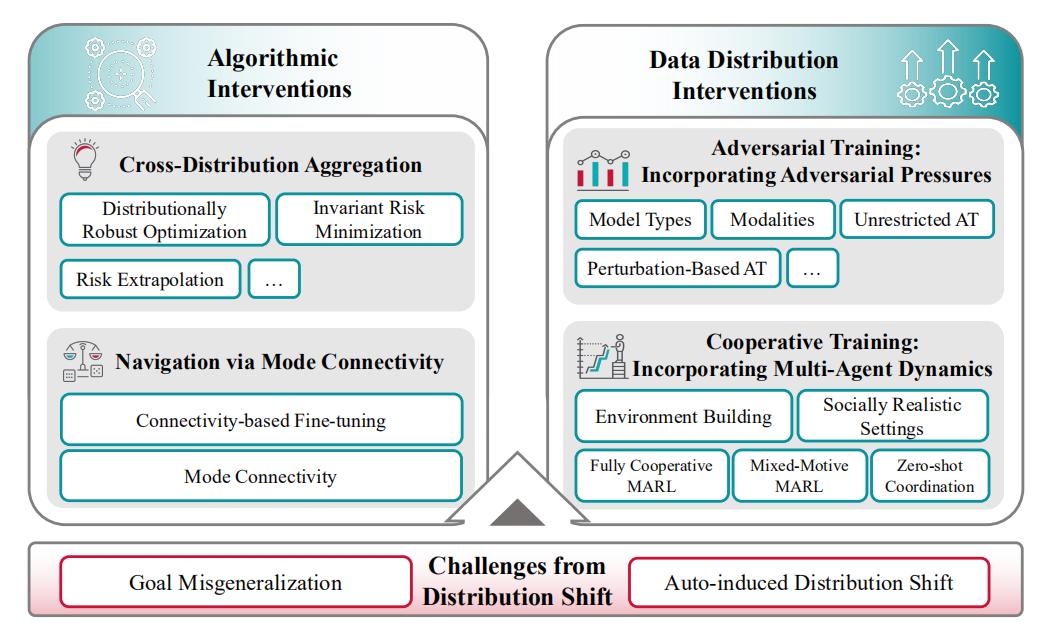 解决分布转移的干预方法包括算法干预,改变训练过程以提高在其他分布下的可靠性,以及数据分布干预,扩展训练分布以减小训练和部署分布之间的差距。前者包括 Risk Extrapolation(REx)和 Connectivity-based Fine-tuning(CBFT)等方法。后者包括对抗性训练,通过对抗输入扩展训练分布,以及协同训练,旨在解决单一代理和多代理环境之间的分布差距。