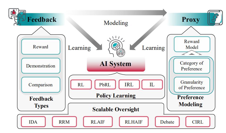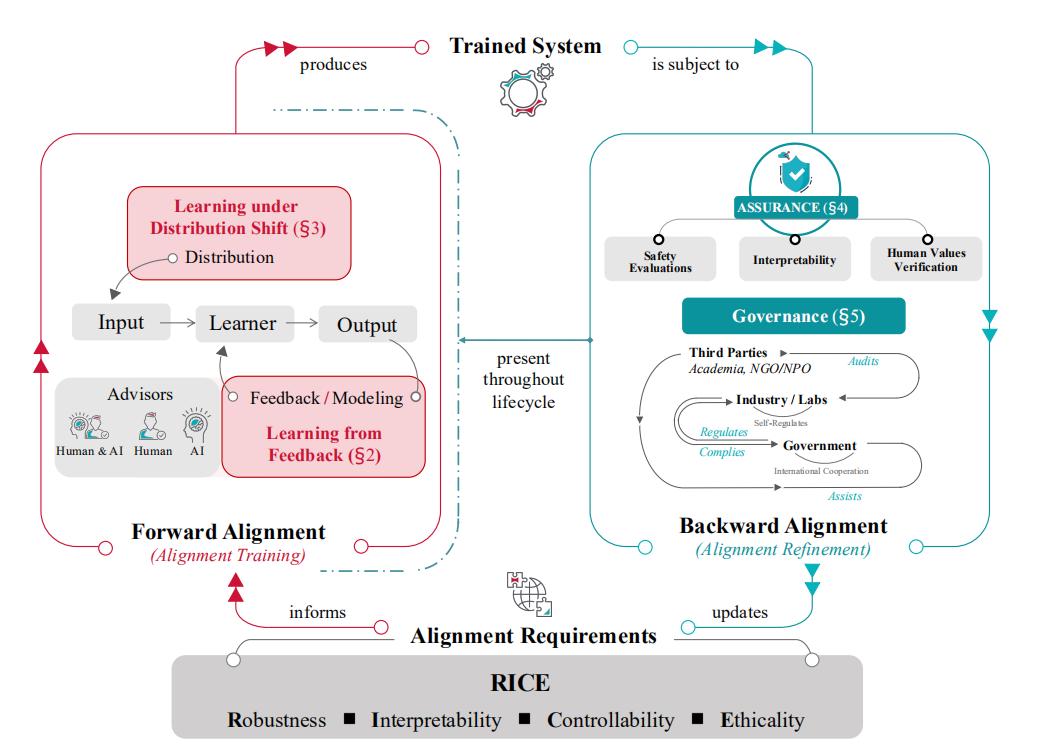 在前向对齐和后向对齐中,研究共讨论了四种 AI 对齐的方法和实践。
