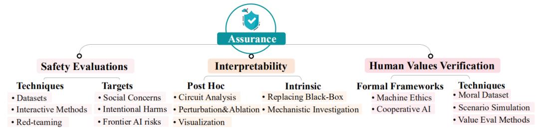 保证的方法包括安全性评估以及更高级的方法,例如可解释性技术和红队测。保证的范围还包括验证系统与人的价值观的对齐性,包括专注于可证明合作性和道德性的正式理论,以及各种经验性和实验性方法。