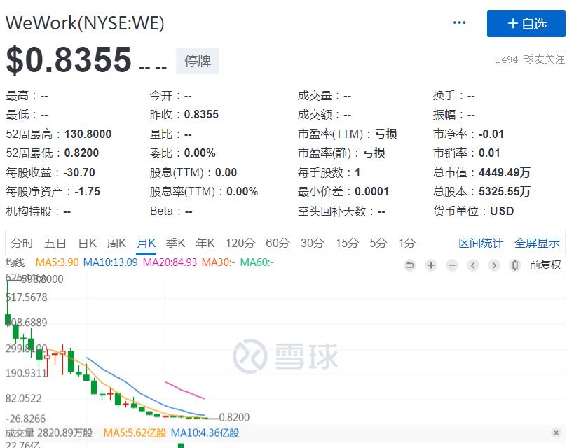 WeWork股价已经跌至约10美分左右,周一停牌前大约在83美分左右交易。
