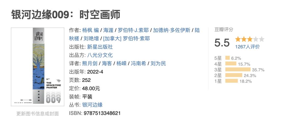 海漄的小说《时空画师》收录于《银河边缘》系列丛书。这部丛书目前已经出到了第十五辑,收录了国内外不少作家的科幻作品,在获得雨果奖之前,该系列每辑在豆瓣上的评分人数都只有两位数,属于几乎没有人阅读和反馈的内容。雨果奖之后,包括《时空画师》的获奖使第九辑读者量暴增,并立刻冲上了当当网的小说畅销榜。