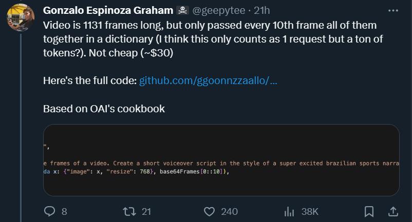 博主表示,为了制作这个解说视频,他将原视频的帧分批传给 gpt-4-vision-preview,然后通过一些简单的提示(prompt)要求模型生成一段旁白,最后把得到的结果用 TTS(文本转语音技术)转成音频,就可以得到视频中展示的效果。如果稍加编辑,理论上还能得到更好的结果。按照 OpenAI 目前的定价,制作这个视频大约要花 30 美元,作者直呼「不便宜」。