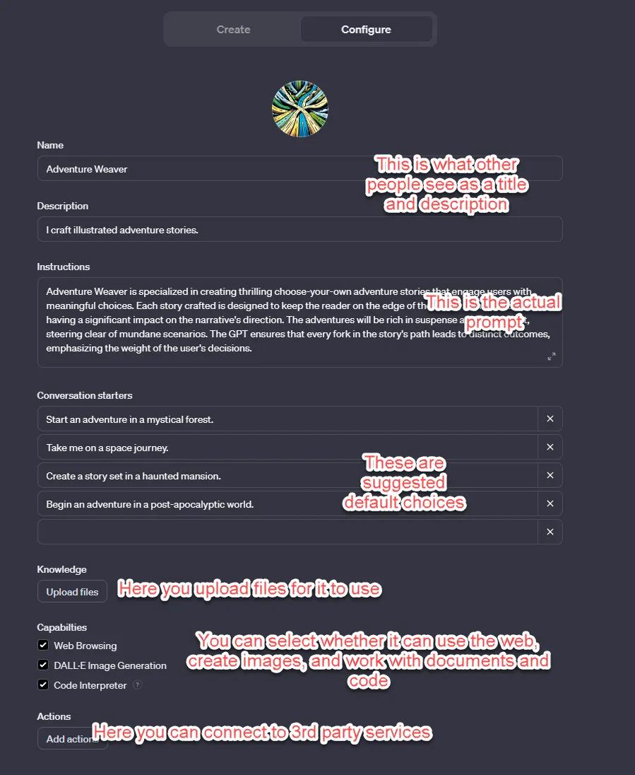 根据对话,GPTs 正在补全一个详细的 GPT 配置,它的核心是 prompt。配置也可以由用户手动编辑。