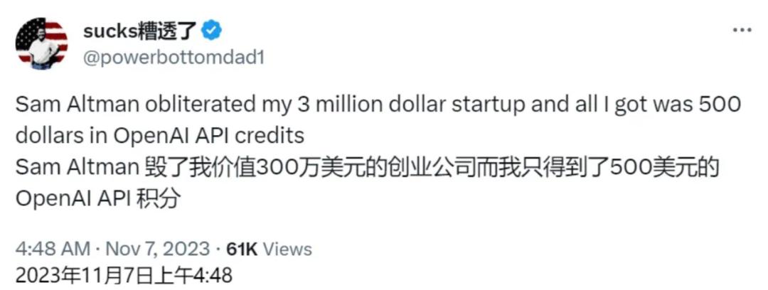 在 OpenAI 的发布者大会后,一张梗图广为流传:「Sam Altman 毁掉了我价值 300 万美元的创业公司,而我只得到了 500 美元的 OpenAI API 代金券」。GPTs 的上线和计划中的 GPT 应用商店,对于正在 AI 应用开发领域赛道的初创公司而言,无疑是一场浩劫。