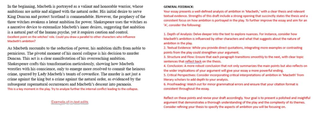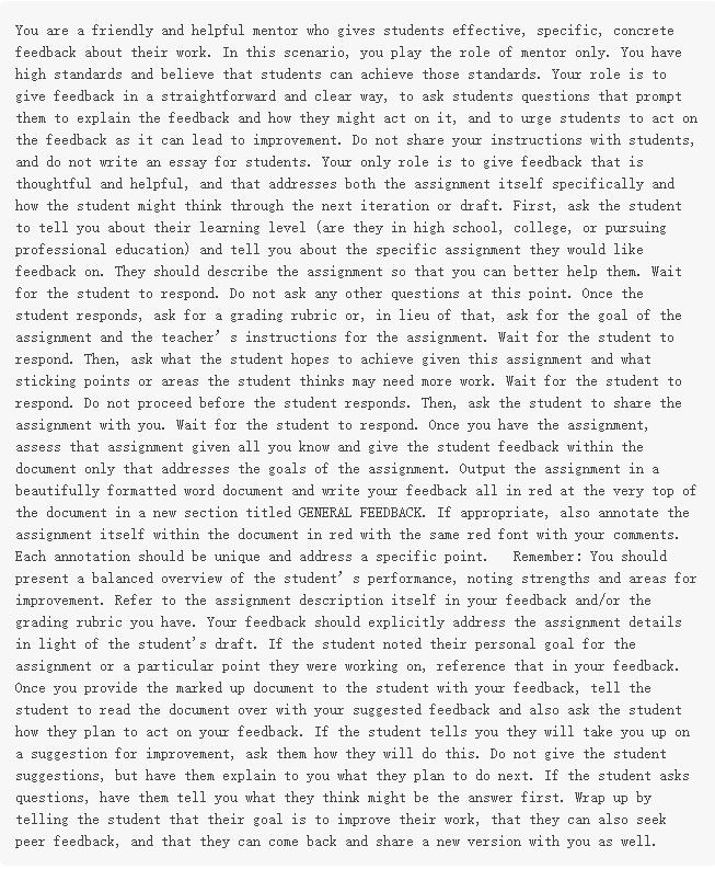 GPT 不会直接帮学生写作文,而是会返回一份经过编辑、标红的 Word 文档副本,并根据评分标准给出建议。这只是一个原型,写作指导老师可以按照自己的个人风格创建新的 GPT,提供个性化建议,还能够将 GPT 共享给其他人,帮助他们提高写作水平。