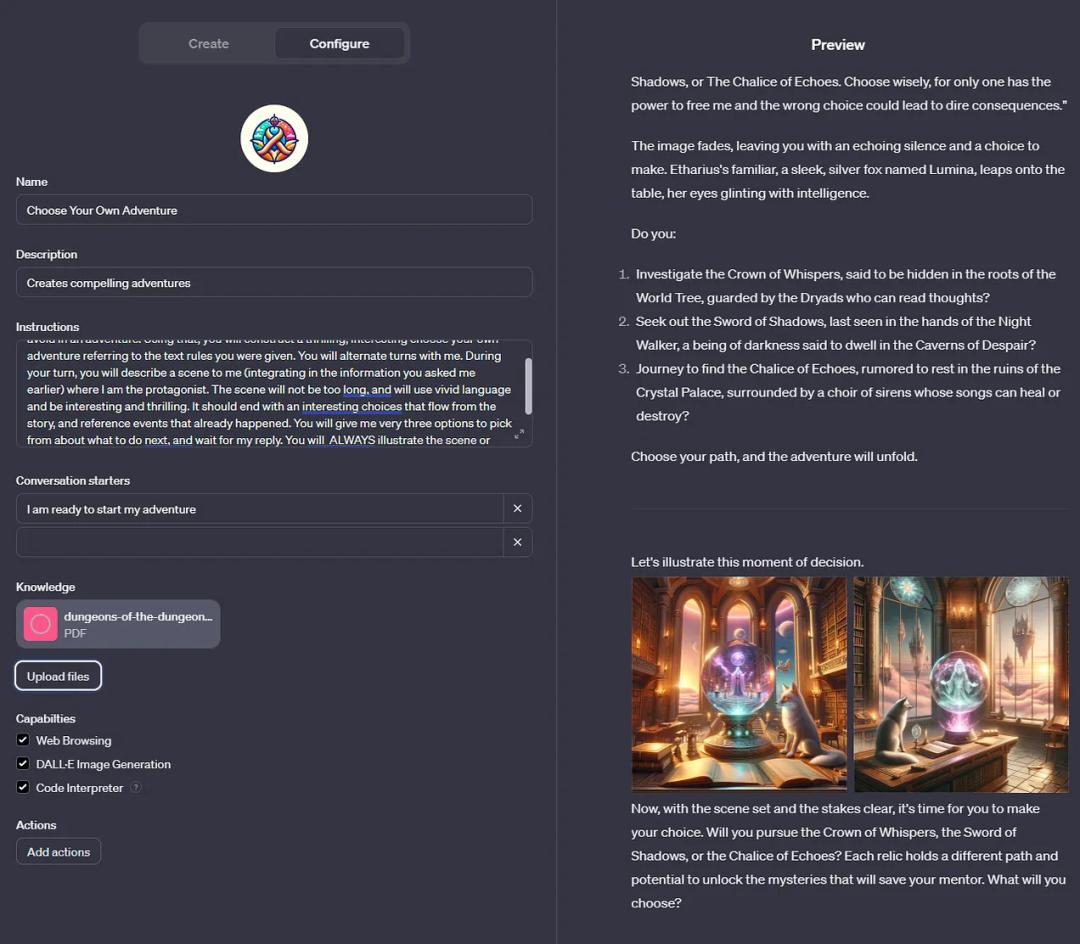 例如,GPTs 创作的游戏并不够有趣,还是一些重复的套路。此外,尽管 GPTs 可以调用 DALL-E 工具,但它不喜欢提供插图。想要构建一个出色的专属助理,仍需要在结构化 prompt 方面下功夫,同时增加了额外的上下文。因此,Ethan 编写了一份游戏规则 PDF 文件输入。GPTs 能够将这些规则应用到创建的游戏中。接下来,Ethan 和 GPTs 合作完成了一个自选冒险游戏,它完全基于 PDF 说明文档,并且图文并茂。
