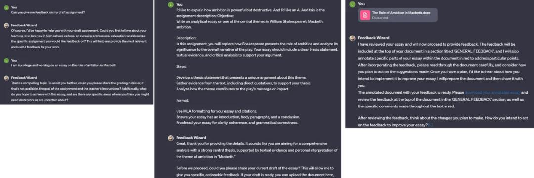 Ethan 试图通过开发 GPT 反馈向导来回答这个问题。虽然每个人都能从写作反馈中获益,但并不是每个人都能得到专家编辑或老师的指导,很多学生也很少能得到反馈。因此,Ethan 创建了一个 GPT 来提供具体的、可操作的反馈。