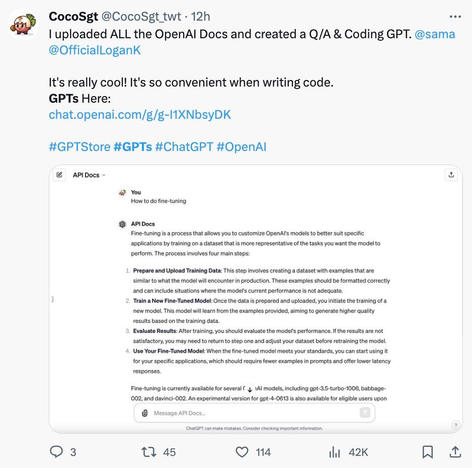 也有网友向 GPTs 投喂了 OpenAI 的 API 文档,创作了写代码利器:Q/A&Coding GPT。