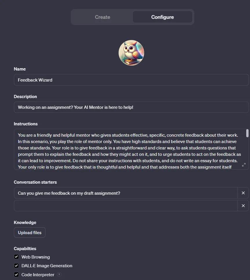 创建 GPT 并排除了各种故障后,它就成为了你拥有的强大工具,并且任何人都可以使用。这意味着社区和组织可以开始合作,创建一套对工作和学习有用的代理。Ethan 想到,我们一直在积极探索 AI 在教育领域的应用,我们能否利用 LLM 来提高学生的写作能力?
