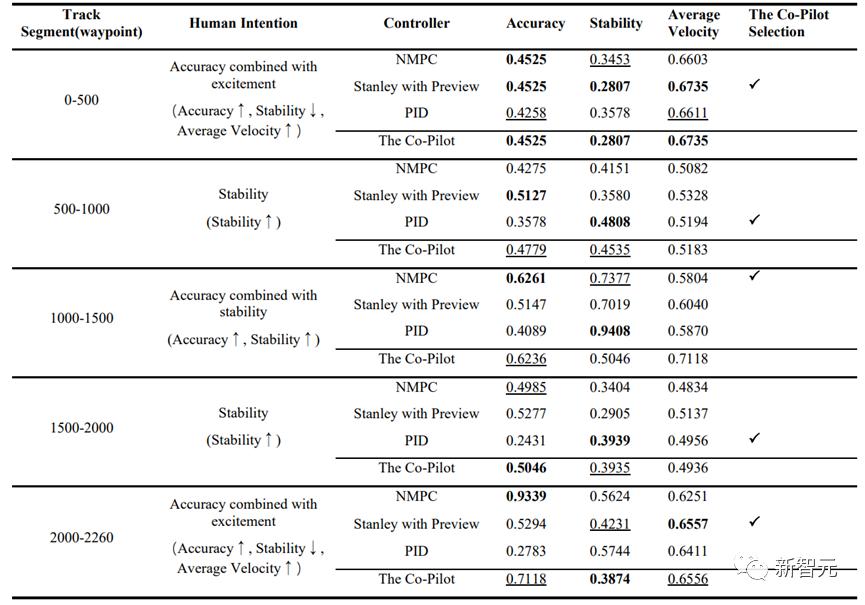 赛道被分为五个区段,研究人员根据Co-Pilot是否在各区段选出了最符合当前乘客意图的控制器进行打分(每个区段最优1分,次优0.5分,最差0分,赛道总分最高为5分),分析不同记忆对于Co-Pilot表现的影响,研究人员在「精确跟踪」与「保持稳定」两种意图下分别测试,测试结果显示,A1仅取得3分,Co-Pilot在所有区段均选择了NMPC控制器。