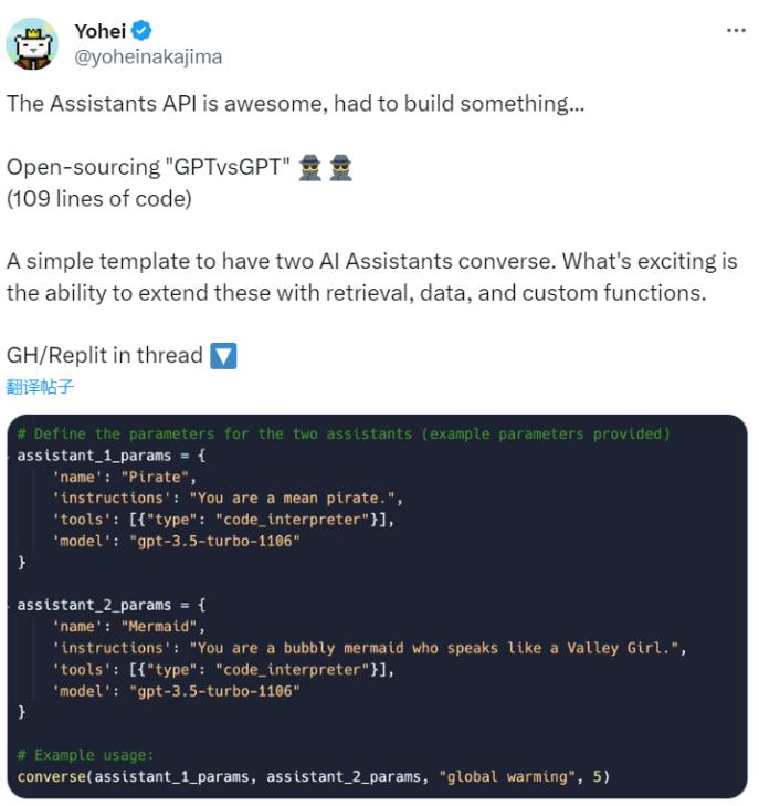 BabyAGI 建设者 Yohei 通过 Assistant API 用 109 行代码创建了开源的“GPTvsGPT”,可以自定义参数,让两个 AI 助手扮演不同的“角色”进行对话。Yohei 表示,“GPT vs GPT”还可以通过检索、数据和自定义函数来扩展功能。