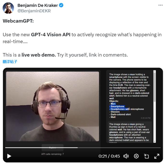 网友 Benjamin De Kraker 通过 GPT-4 Vision API 用大约 10 分钟的时间创建了 WebcamGPT,可以近乎实时地识别摄像头前正在发生的事情,包括物体和动作等。从视频中可以看出,当该网友在镜头前举起手掌、手机等物品时,大约 3 秒后,WebcamGPT 就可以具体写出这些物品。
