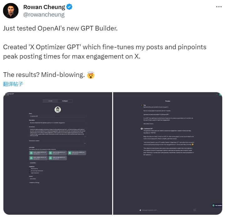 作为拥有 34 万粉丝的大 V,Rowan Cheung 也迫不及待地进行了尝试。他自定义了“X Optimizer GPT”,可以对其想要在 X 上发的帖子进行微调,并精确定位高峰发布时间,从而帮助其在 X 上获得更多的曝光。具体的做法是,先从 Twitter 分析中下载帖子数据,然后配置自定义指令,让 X Optimizer GPT 撰写帖子并确定发布时间。