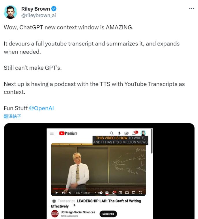 网友 Riley Brown 对此次 OpenAI 带来的 128 k 上下文窗口大加赞赏。在演示中,该网友首先拷贝了长达近 90 分钟的 YouTube 视频讲座字幕,然后在 GPT 4 中输入总结指令,GPT 4 便迅速整理出了该讲座每一个部分的要点。而且,还可以根据每个要点要求 GPT 4 进行扩展。
