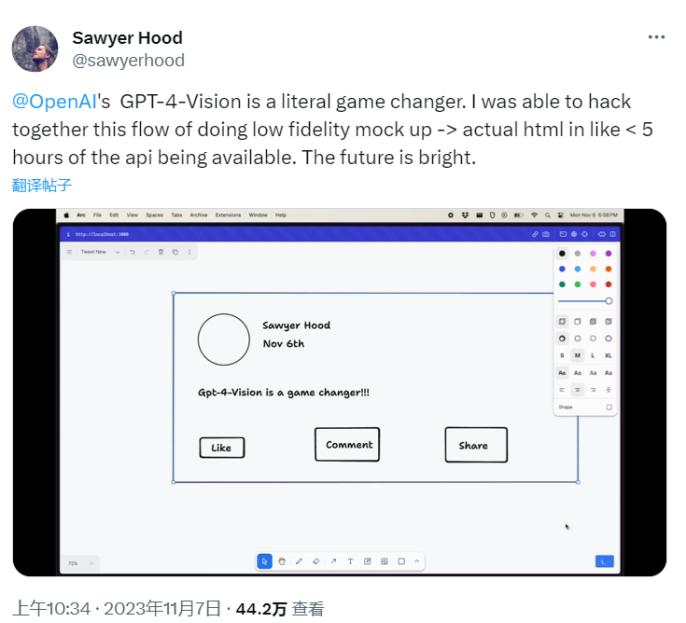 网友 Sawyer Hood 利用 GPT-4-Vision 在 5 个小时内完成了从低保真的模型到实际 HTML 网站的建设流程。视频演示中,该网友简单用绘画工具勾勒了一个类似社交页面的草图,然后 GPT-4V 瞬间就把它变成了 HTML 网页。只能说,真的神奇。目前,该演示的源代码也已在 GitHub 开源。