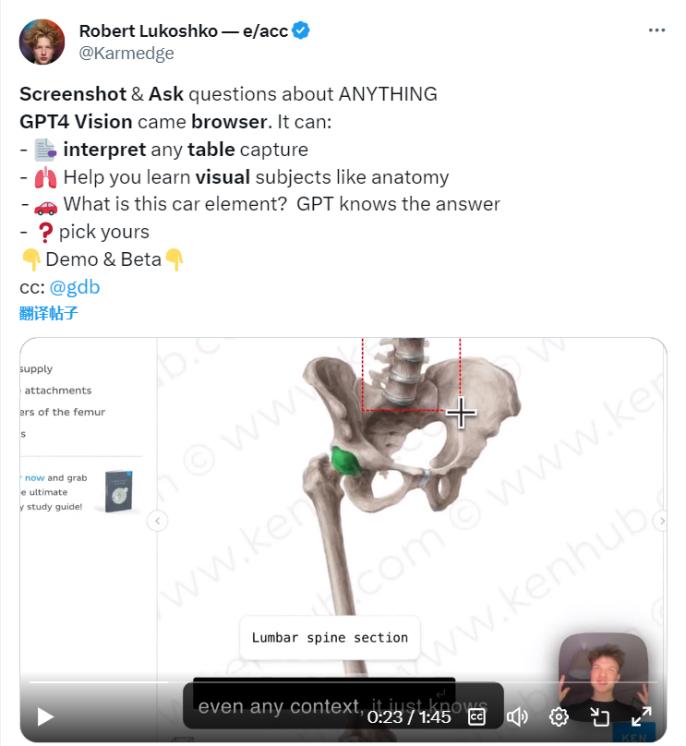 另一网友 @Karmedge 通过 GPT-4 V 应用程序接口定制出了 GPT4 Vision 浏览器,只要截图就可以询问任何问题,可以说是新一代的哪里不会“圈”哪里。从该网友的演示视频中可以看出,即使是在不给出任何上下文背景的情况下,GPT-4 也能准确回答出诸如骨骼、数学符号,汽车零部件的名称。