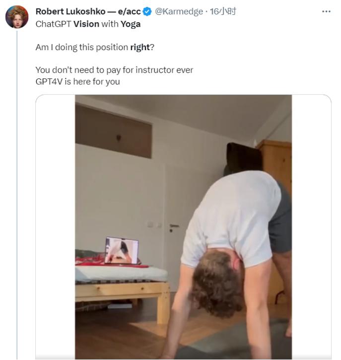 另外,这位小哥还做了个有趣的试验,在用 GPT4 V 构建完新模型后,通过电脑摄像头,它就成为了私人瑜伽教练,你可以直接询问它“我的动作准确不?”,这位“教练”便会给出它贴心的动作指导。