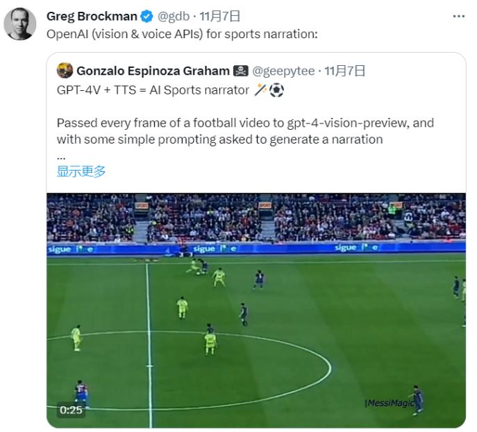 网友 @geepytee 将足球视频的每一帧画面传递给 gpt-4-vision-preview,并通过一些简单的提示要求生成旁白,然后通过 TTS(从文本到语音)就得到了以下画面。该网友表示,这一过程完全由模型直出,未进行任何修改,也就是说,如果加以调整,完全可以做得更好。