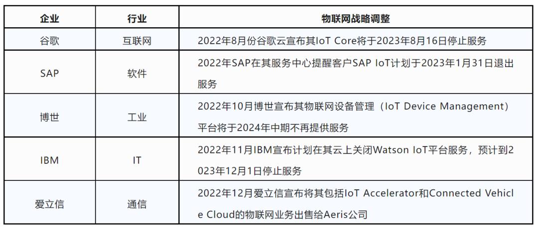 物联网智库曾在《物联网平台成“弃子”?谷歌/爱立信/IBM/博世/SAP等巨头集体退出!》一文中总结了2022年对物联网平台业务进行重大调整的企业,如下图: