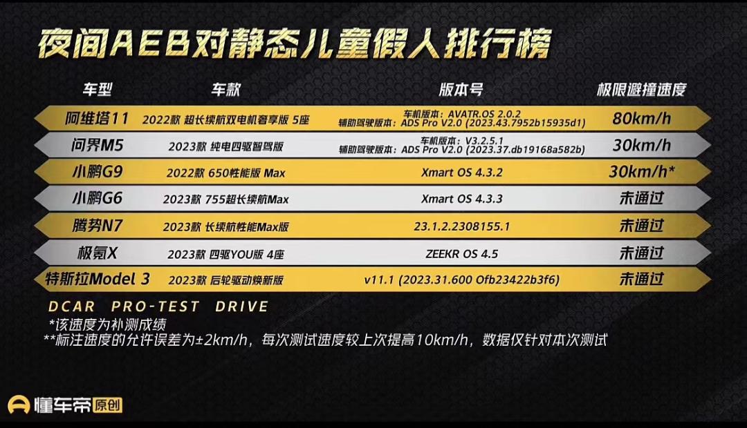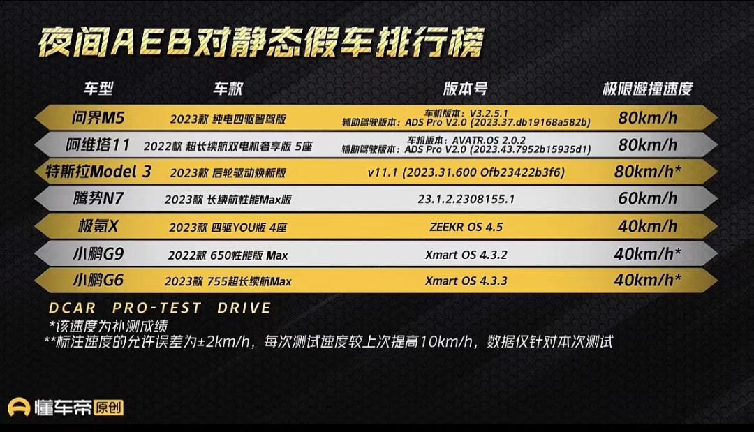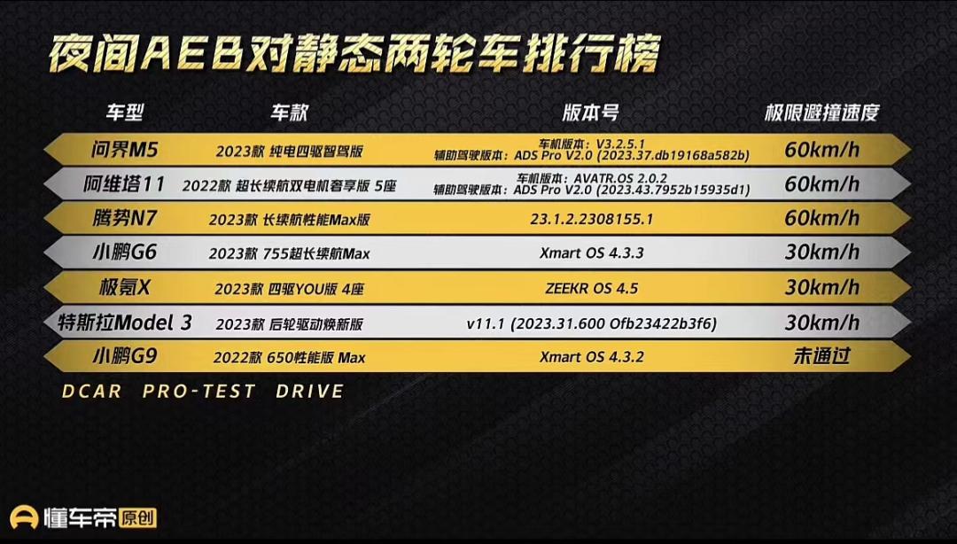 据懂车帝昨晚(7日)发布的视频,懂车帝一共测试了7款车型,包括腾势N7、极氪X、小鹏G6、小鹏G9、问界M5 EV、特斯拉Model 3、阿维塔11。测试时间为晚上,并且没有路灯。测试道具包括假人、假车和假二轮车。